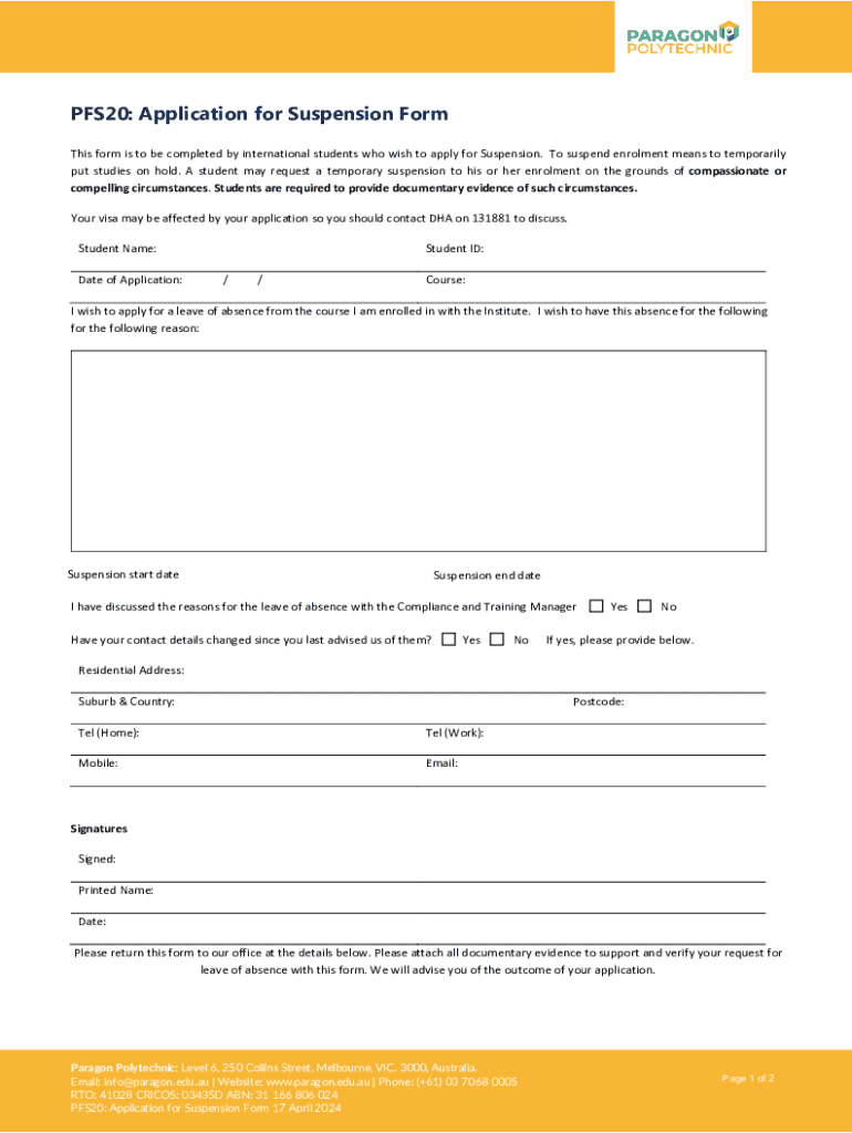 PFS20: Application for Suspension Form This form is to be completed by international students who wish to apply for Suspension. To suspend enrollment means to temporarily put studies on hold. A student