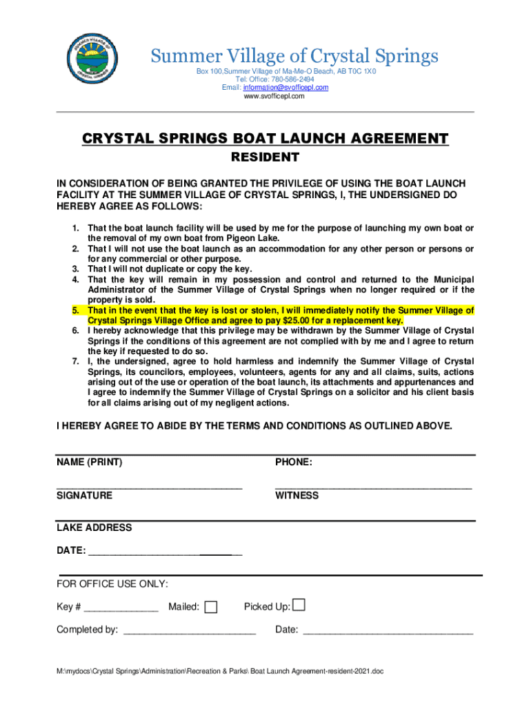 Summer Village of Crystal Springs Box 100,Summer Village of MaMeO Beach, AB T0C 1X0 Tel: Office: 7805862494 Email: information@svofficepl.com www.svofficepl.comCRYSTAL SPRINGS BOAT LAUNCH AGREEMENT