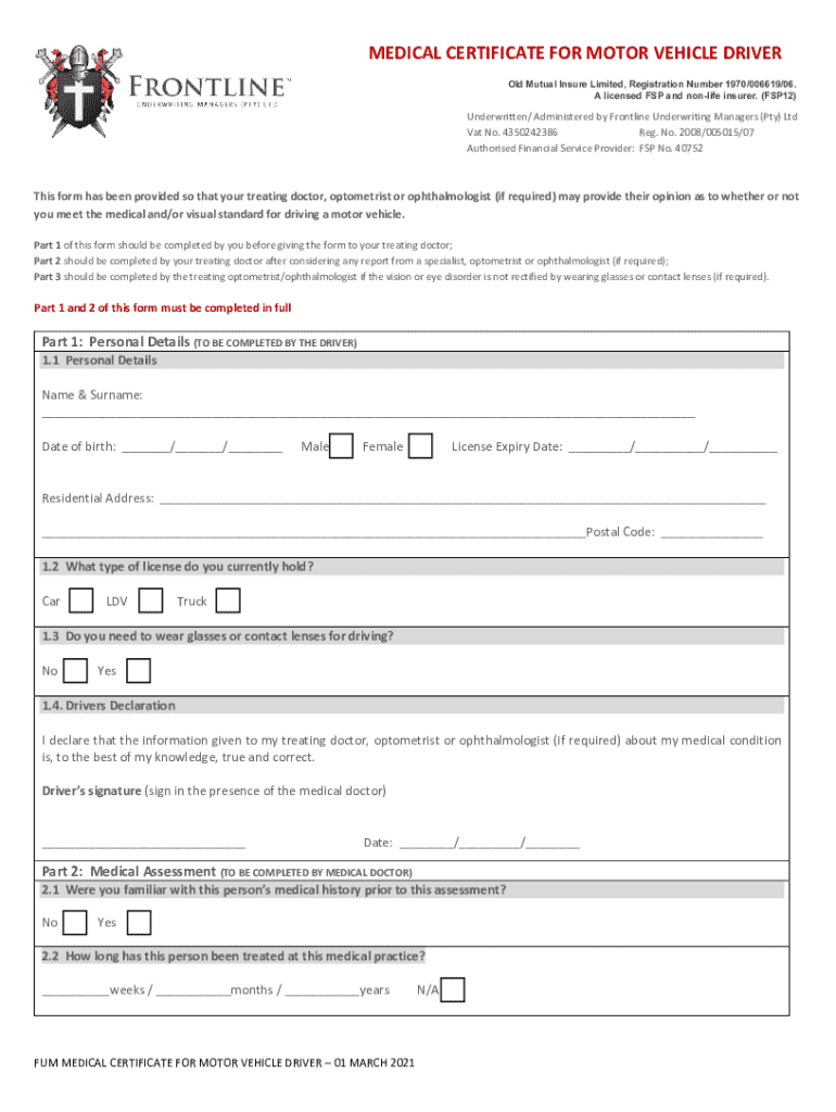 MEDICAL CERTIFICATE FOR MOTOR VEHICLE DRIVER Old Mutual Insure Limited, Registration Number 1970/006619/06. A licensed FSP and nonlife insurer. (FSP12)Underwritten/ Administered by Frontline Underwriting