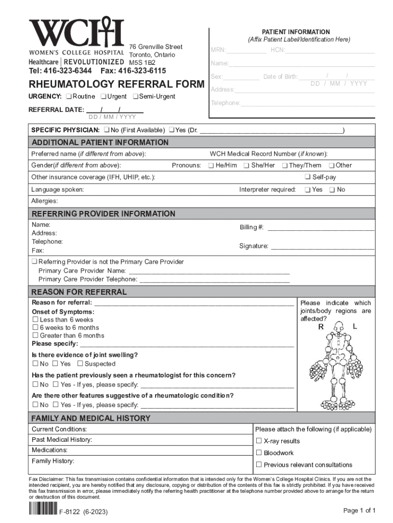 Tel: 416323634476 Grenville Street Toronto, Ontario M5S 1B2Fax: 4163236115RHEUMATOLOGY REFERRAL FORM URGENCY:RoutineREFERRAL DATE:Urgent /SemiUrgentPATIENT INFORMATION (Affix Patient Label/Identification