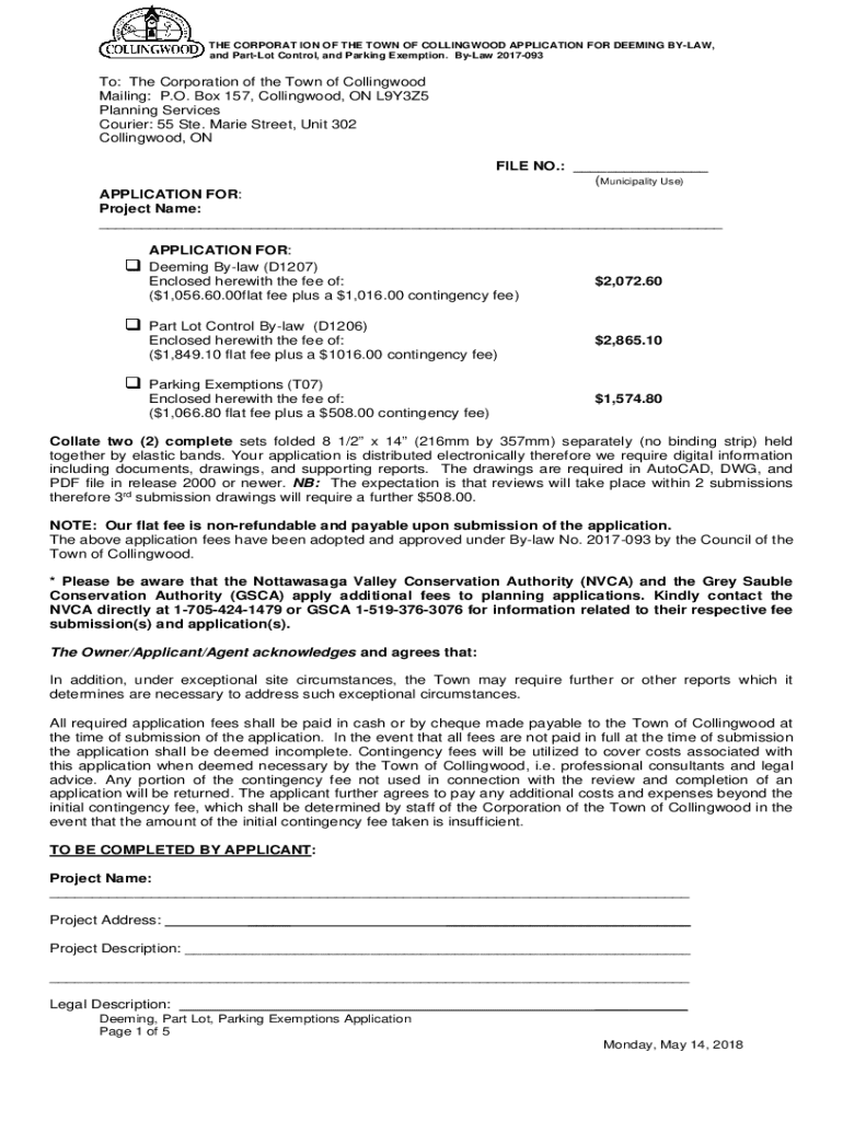 THE CORPORAT ION OF THE TOWN OF COLLINGWOOD APPLICATION FOR DEEMING BYLAW, and PartLot Control, and Parking Exemption. ByLaw 2017093To: The Corporation of the Town of Collingwood Mailing: P.O. Box