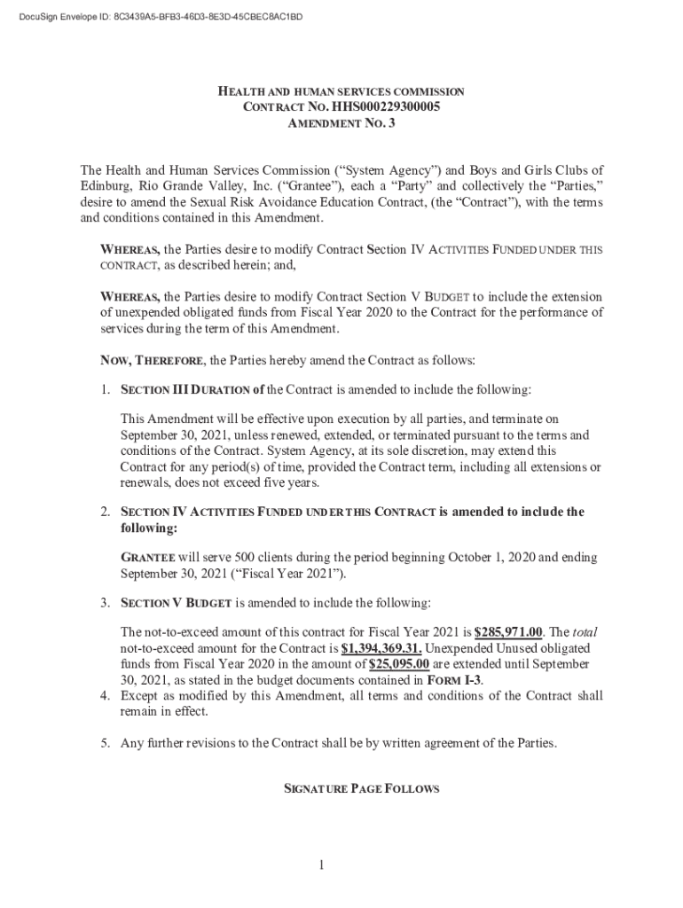HEALTH AND HUMAN SERVICES COMMISSION CONTRACT NO. HHS000229300005 AMENDMENT NO. 3 The Health and Human Services Commission (System Agency) and Boys and Girls Clubs of Edinburg, Rio Grande Valley,