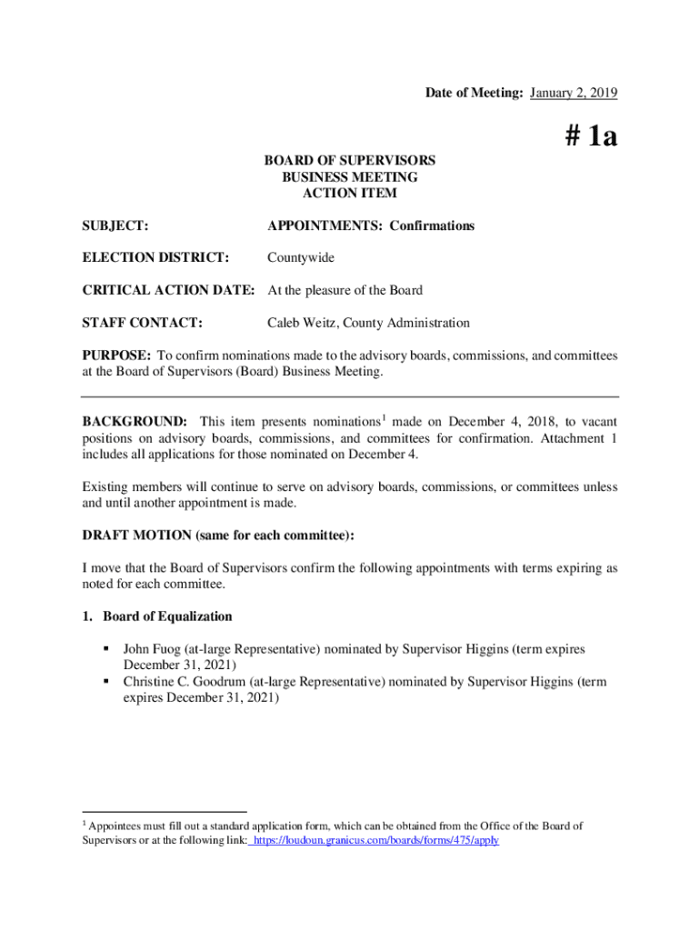 SUBJECT:APPOINTMENTS: ConfirmationsELECTION DISTRICT:CountywideCRITICAL ACTION DATE: At the pleasure of the Board