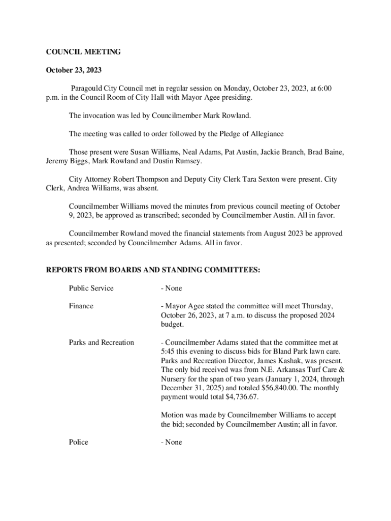 COUNCIL MEETING October 23, 2023, Paragould City Council met in regular session on Monday, October 23, 2023, at 6:00 p.m. in the Council Room of City Hall with Mayor Age presiding. The invocation
