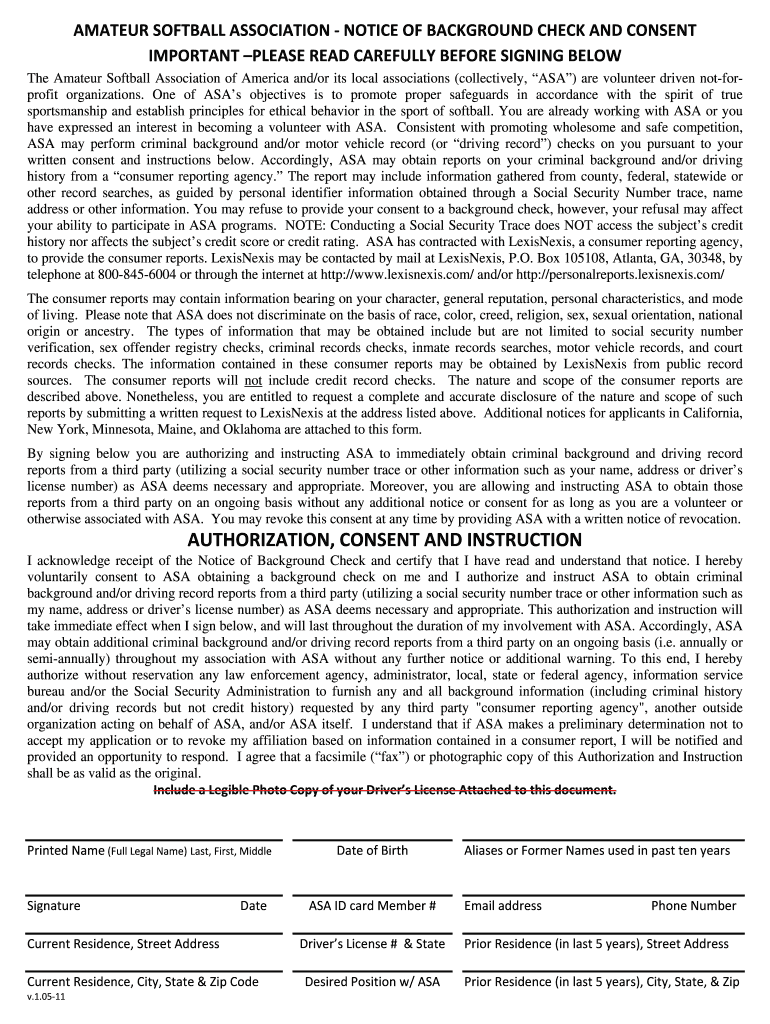 AMATEUR SOFTBALL ASSOCIATION ? NOTICE OF BACKGROUND CHECK AND CONSENT IMPORTANT PLEASE READ CAREFULLY BEFORE SIGNING BELOW The Amateur Softball Association of America and/or its local associations
