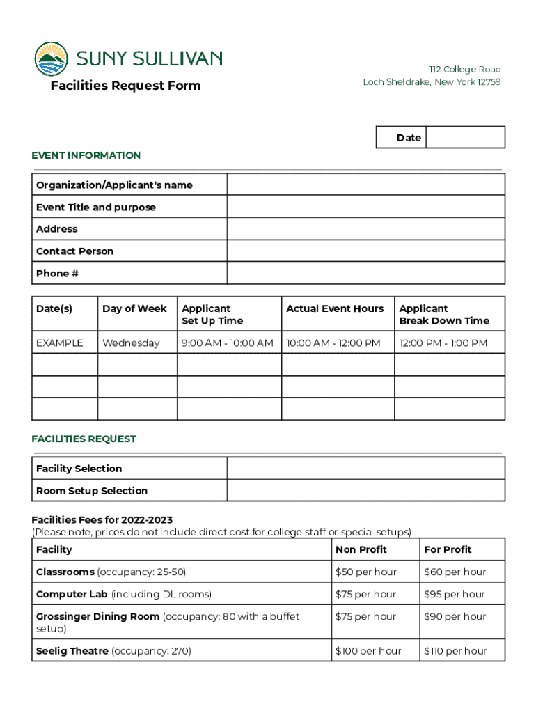 Complete the Facilities Request Form for event hosting at SUN Sullivan. Includes event details, setup options, fees, and catering requirements.