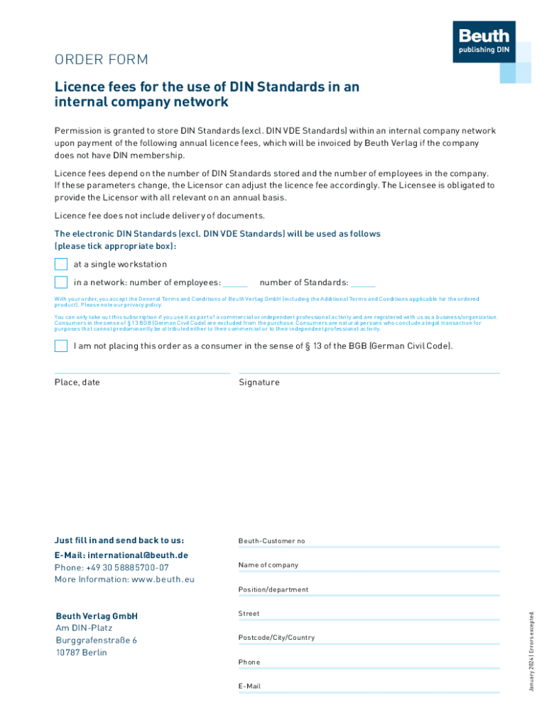 ORDER FORM Licence fees for the use of DIN Standards in an internal company network Permission is granted to store DIN Standards (excl. DIN VDE Standards) within an internal company network upon payment
