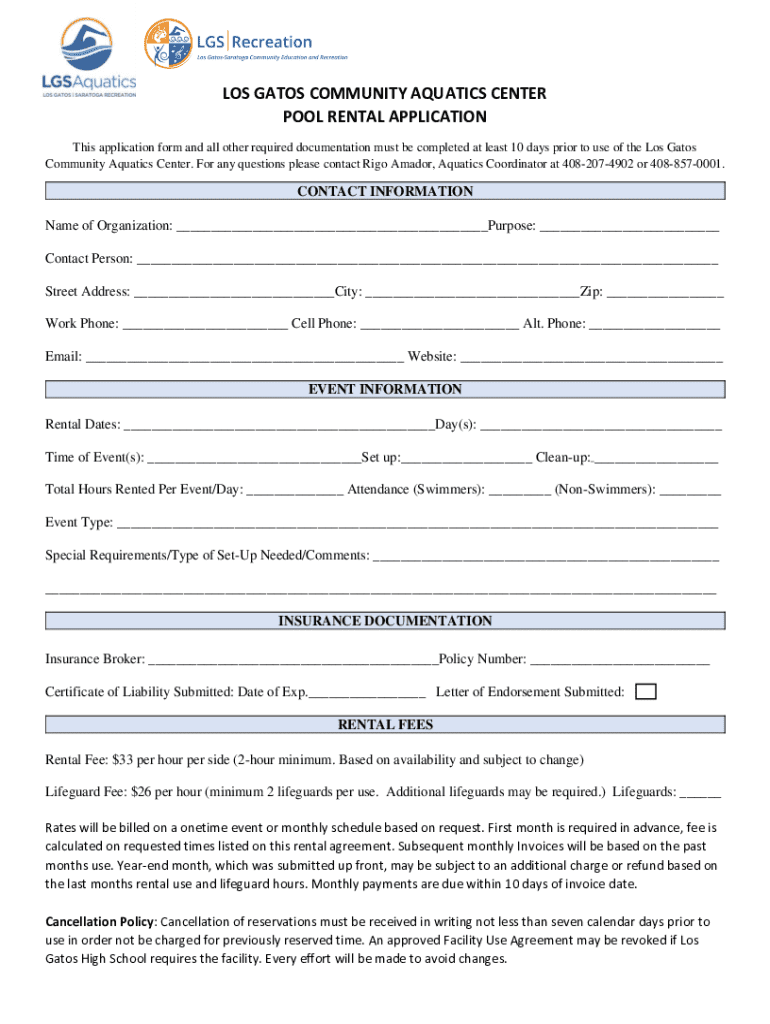LOS GATOS COMMUNITY AQUATICS CENTER POOL RENTAL APPLICATION This application form and all other required documentation must be completed at least 10 days prior to use of the Los Gatos Community Aquatics