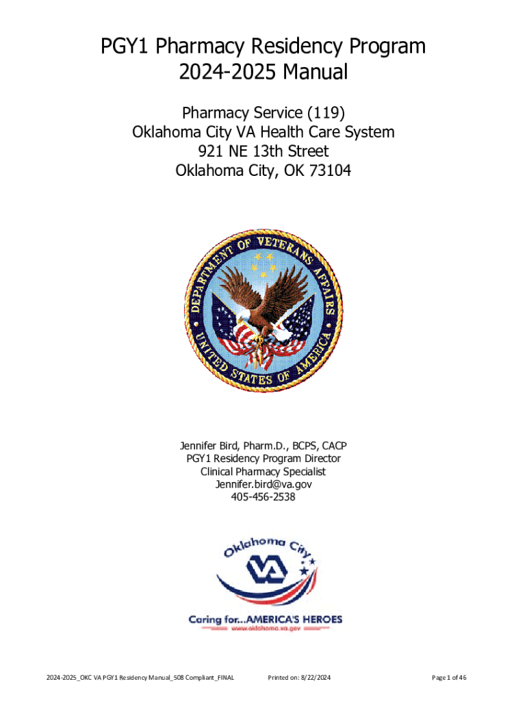 PGY1 Pharmacy Residency Program 20242025 Manual Pharmacy Service (119) Oklahoma City VA Health Care System 921 NE 13th Street Oklahoma City, OK 73104Jennifer Bird, Harm.D., BPS, CAMP PGY1 Residency