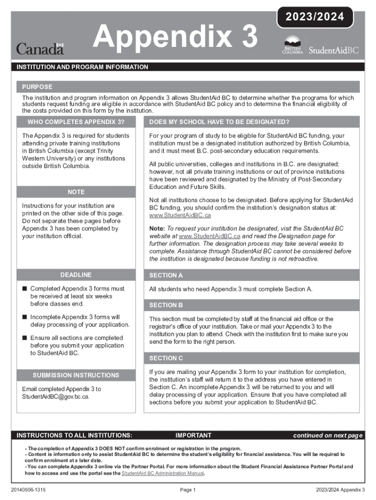 Get the free The institution and program information on Appendix 3 allows StudentAid BC to determ...
