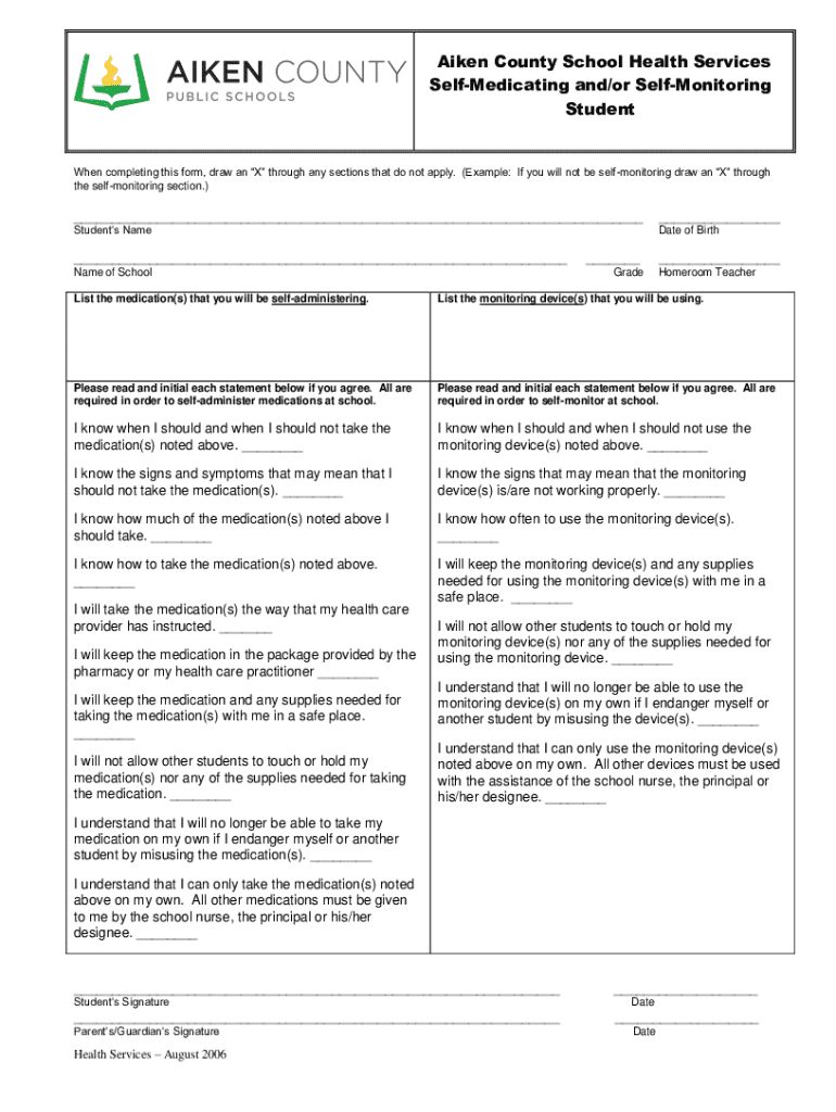Aiken County School Health Services Self-medicating and/or Telemonitoring Studentship completing this form, draw an X through any sections that do not apply. (Example: If you will not be self monitoring