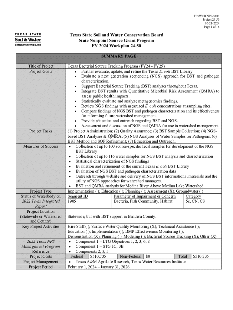 TSSWCB NPSState Project 2450 06212024 Page 1 of 16Texas State Soil and Water Conservation Board State Nonpoint Source Grant Program FY 2024 Workplan 2450 SUMMARY PAGE Title of Project Project GoalsProject