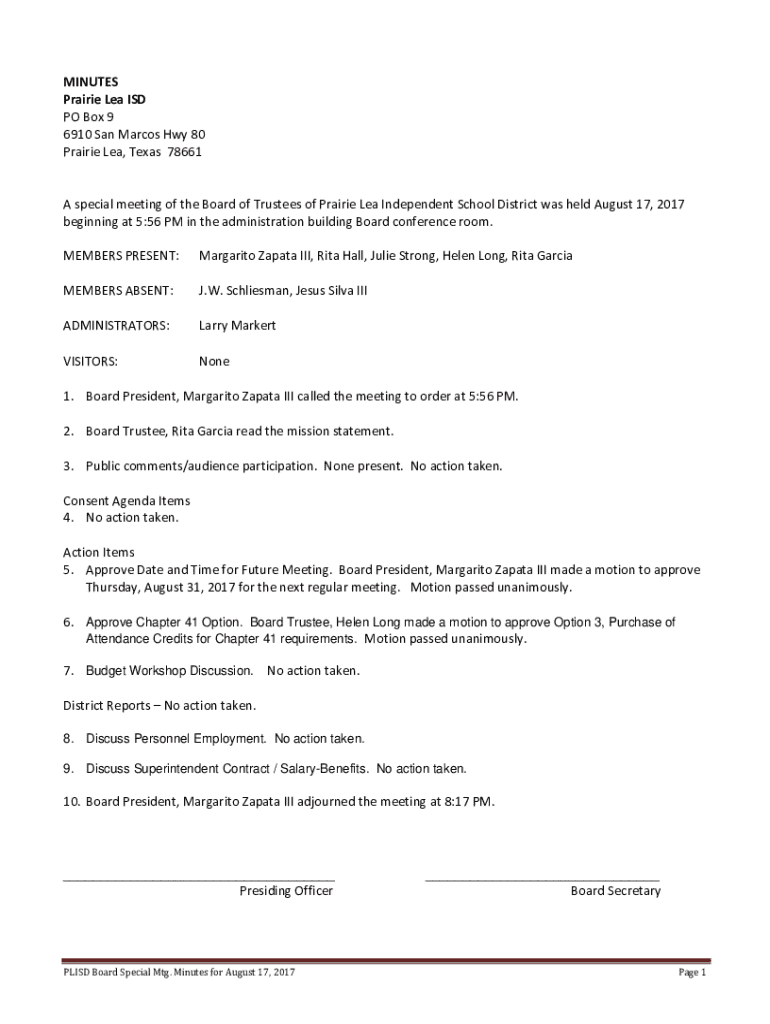 Official minutes from the Prairie Lea ISD Board meeting held on August 17, 2017, detailing attendance, discussions, and approved actions.
