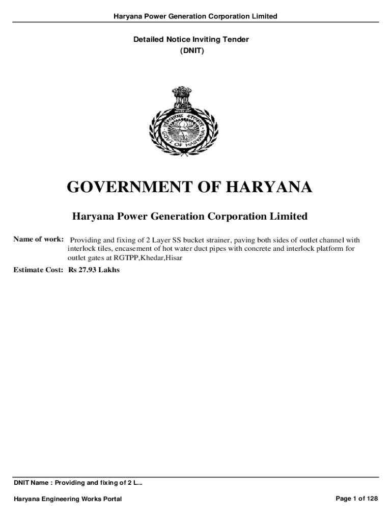 Haryana Power Generation Corporation LimitedDetailed Notice Inviting Tender (DNIT)GOVERNMENT OF HARYANA Haryana Power Generation Corporation Limited Name of work: Providing and fixing of 2 Layer SS