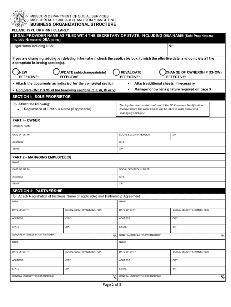 MISSOURI DEPARTMENT OF SOCIAL SERVICES MISSOURI MEDICAID AUDIT AND COMPLIANCE UNITBUSINESS ORGANIZATIONAL STRUCTURE PLEASE TYPE OR PRINT CLEARLYLEGAL PROVIDER NAME AS FILED WITH THE SECRETARY OF STATE,