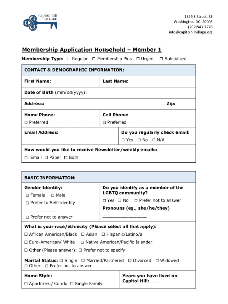 1355 E Street, SE Washington, DC 20003 (202)5431778 info@capitolhillvillage.orgMembership Application Household Member 1b membership Type: Regular Membership Plus Urgent SubsidizedCONTACT & DEMOGRAPHIC
