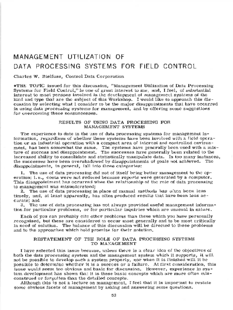 MANAGEMENT UTILIZATION OF DATA PROCESSING SYSTEMS FOR FIELD CONTROL Charles W. Bailouts, Control Data Corporation THE TOPIC issued for this discussion, \”Management Utilization of Data Processing
