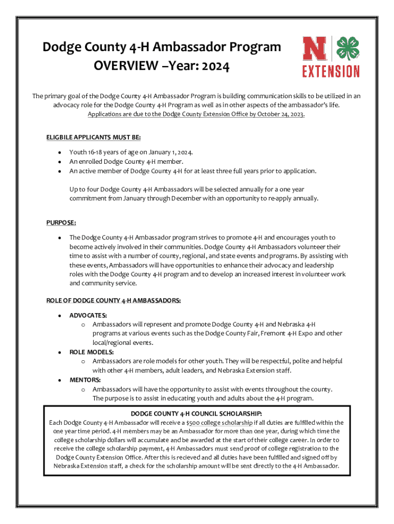 Get the free Dodge County 4-h Ambassador Program Application - extension unl