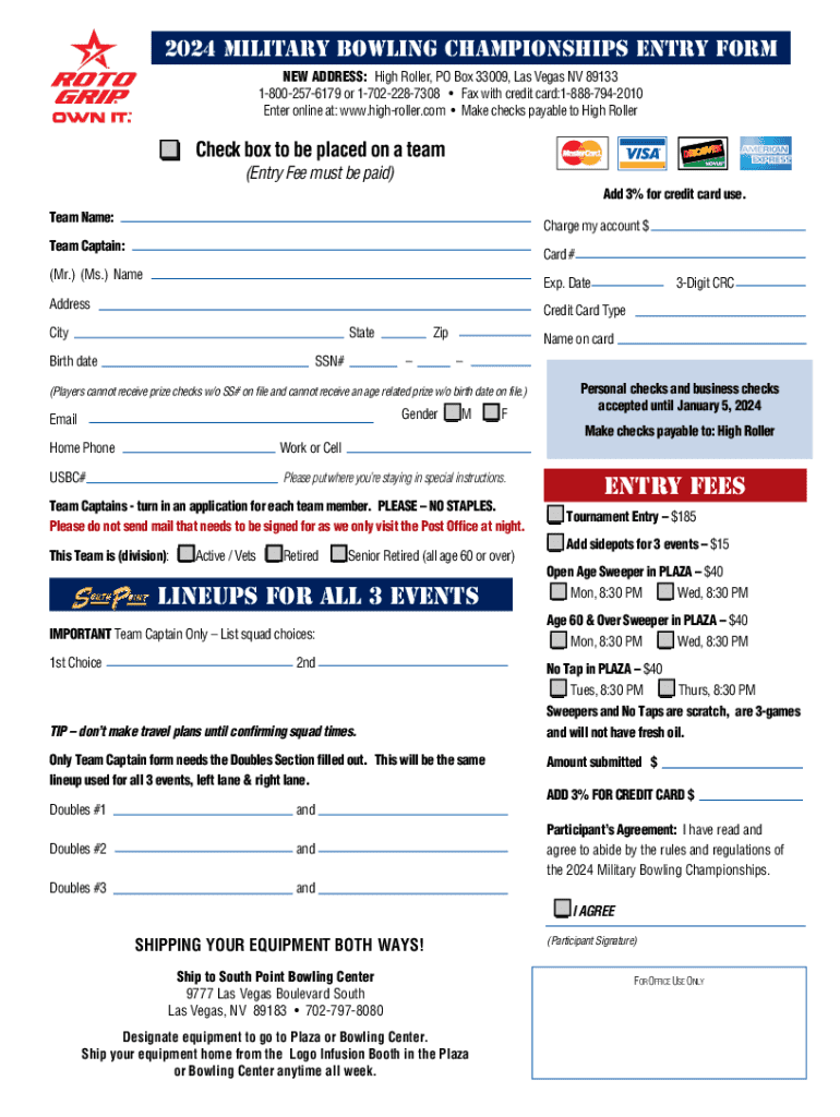 2024 MILITARY BOWLING CHAMPIONSHIPS Entry Form NEW ADDRESS: High Roller, PO Box 33009, Las Vegas NV 89133 18002576179 or 17022287308 Fax with credit card:18887942010 Enter online at: www.highroller.com