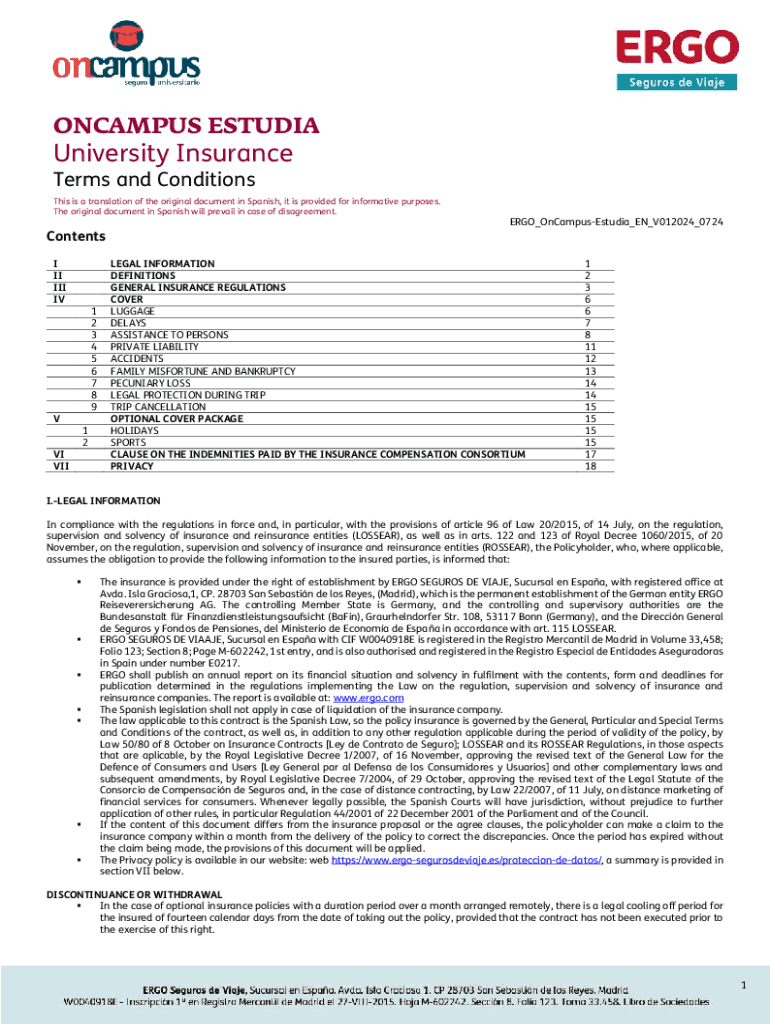 Comprehensive terms and conditions for university insurance covering travel, luggage, and medical assistance for students studying abroad in 2024.