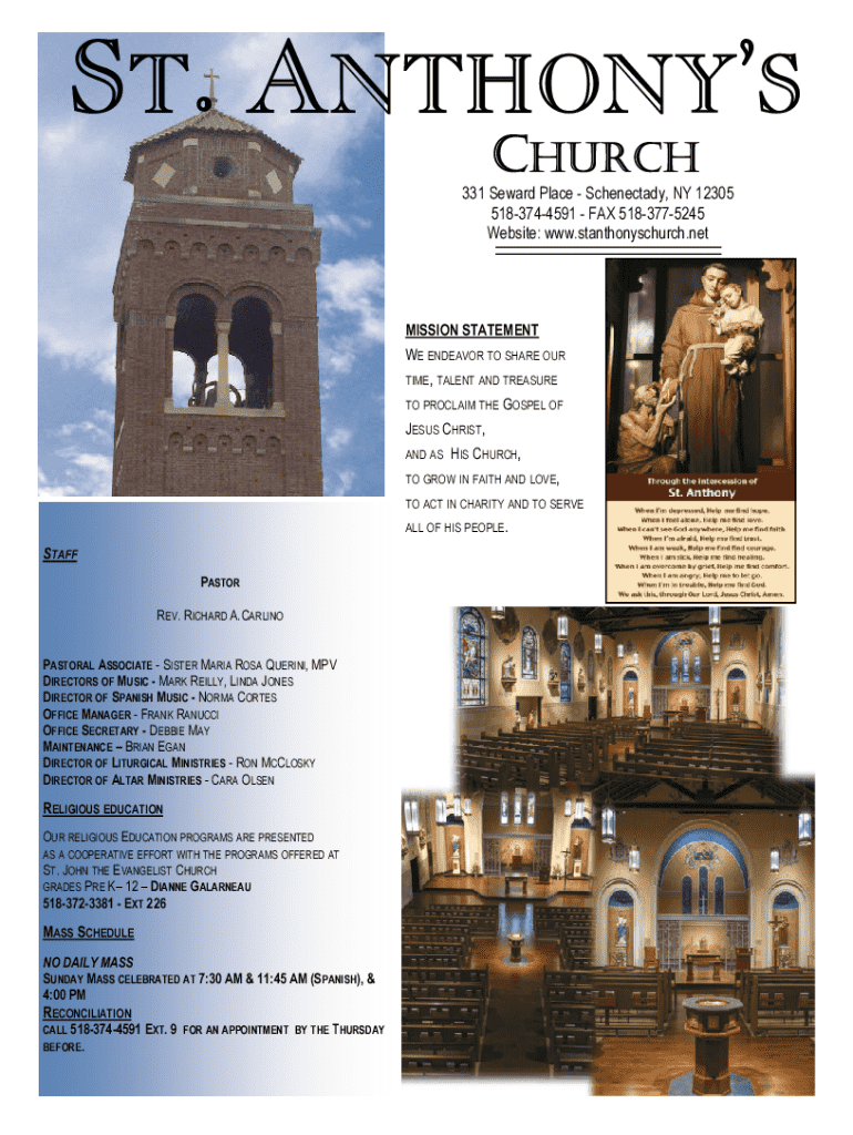ST. ANTHONYS CHURCH331 Seward Place Schenectady, NY 12305 5183744591 FAX 5183775245 Website: www.stanthonyschurch.netMISSION STATEMENT WE ENDEAVOR TO SHARE OUR TIME, TALENT AND TREASURE TO PROCLAIM