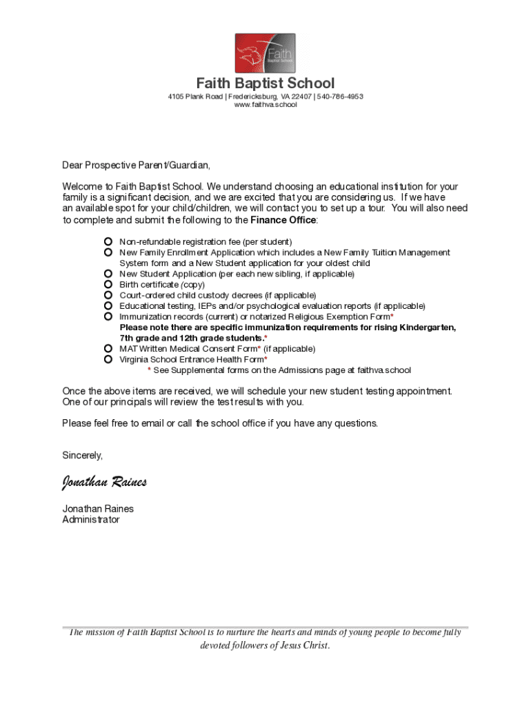 Faith Baptist School 4105 Plank Road | Fredericksburg, VA 22407 | 5407864953 www.faithva.schoolDear Prospective Parent/Guardian, Welcome to Faith Baptist School. We understand choosing an educational