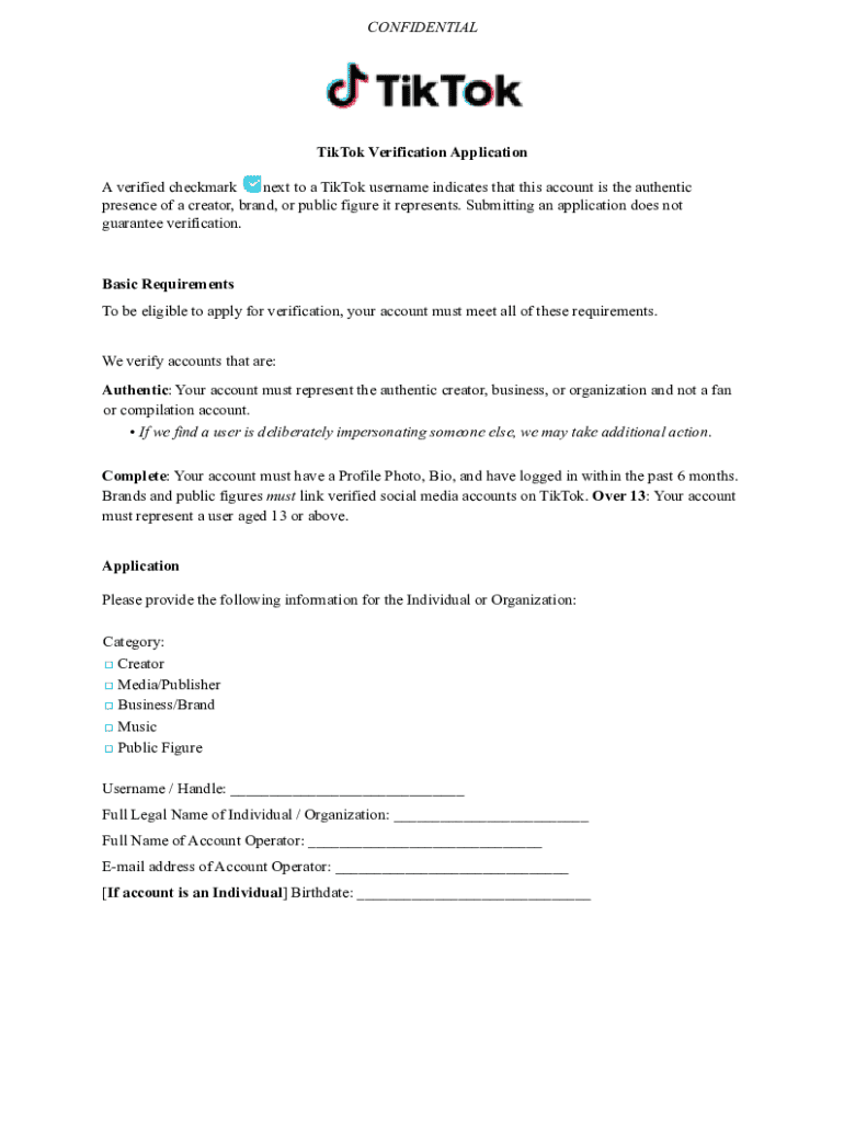 CONFIDENTIALTikTok Verification Application A verified checkmark next to a TikTok username indicates that this account is the authentic presence of a creator, brand, or public figure it represents.