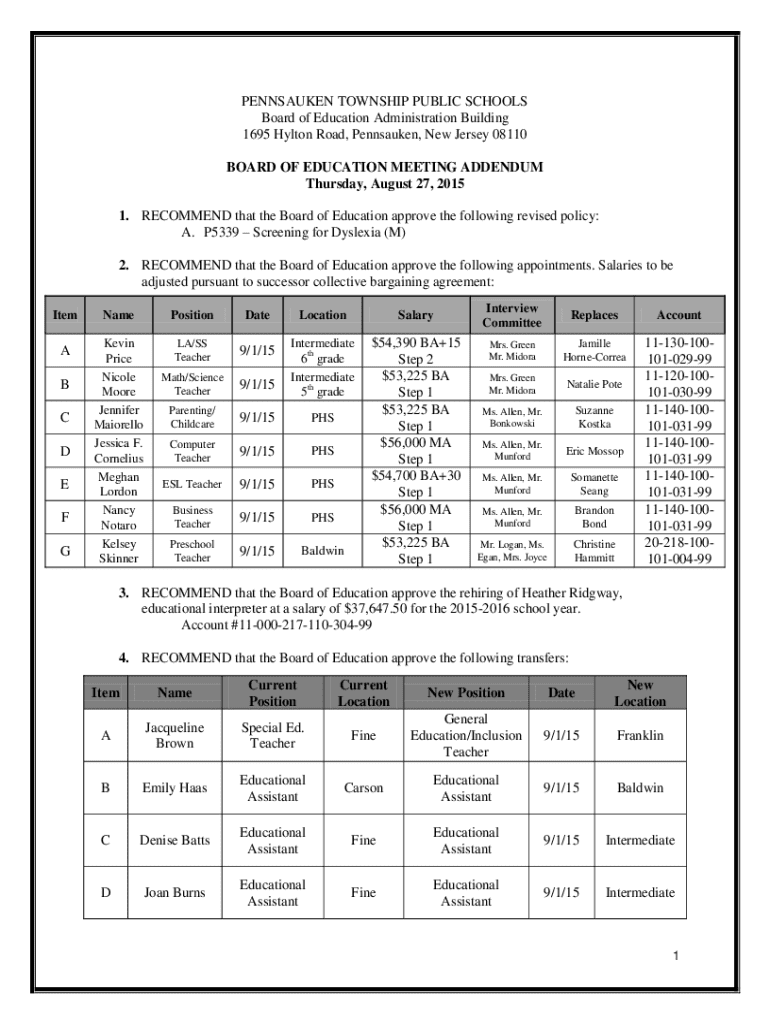 PENNSAUKEN TOWNSHIP PUBLIC SCHOOLS Board of Education Administration Building 1695 Hylton Road, Pennsauken, New Jersey 08110 BOARD OF EDUCATION MEETING ADDENDUM Thursday, August 27, 2015 1. RECOMMEND