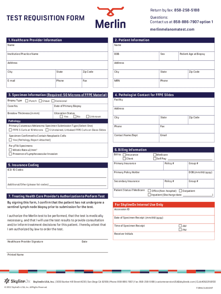 Submit your melanoma test requisition with patient and specimen information. Ensure accurate coding and authorization for necessary testing.