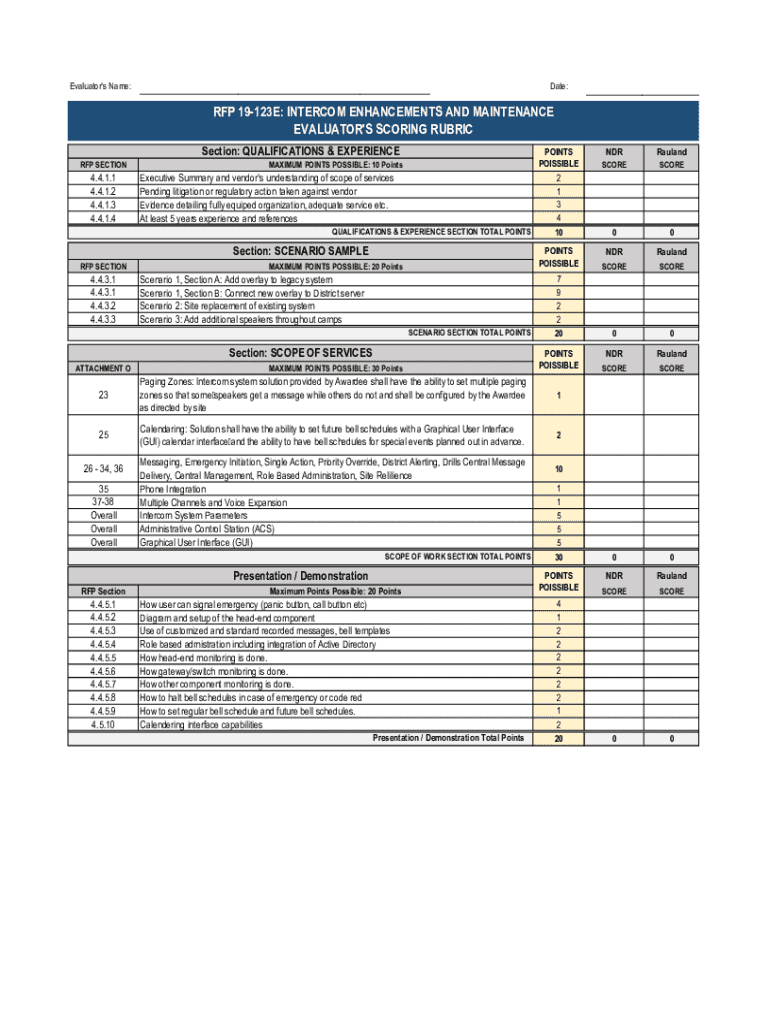 Evaluator\'s Name: ___Date:___RFP 19123E: INTERCOM ENHANCEMENTS AND MAINTENANCE EVALUATOR\'S SCORING RUBRIC RFP SECTION4.4.1.1 4.4.1.2 4.4.1.3 4.4.1.4Section: QUALIFICATIONS & EXPERIENCEMAXIMUM POINTS