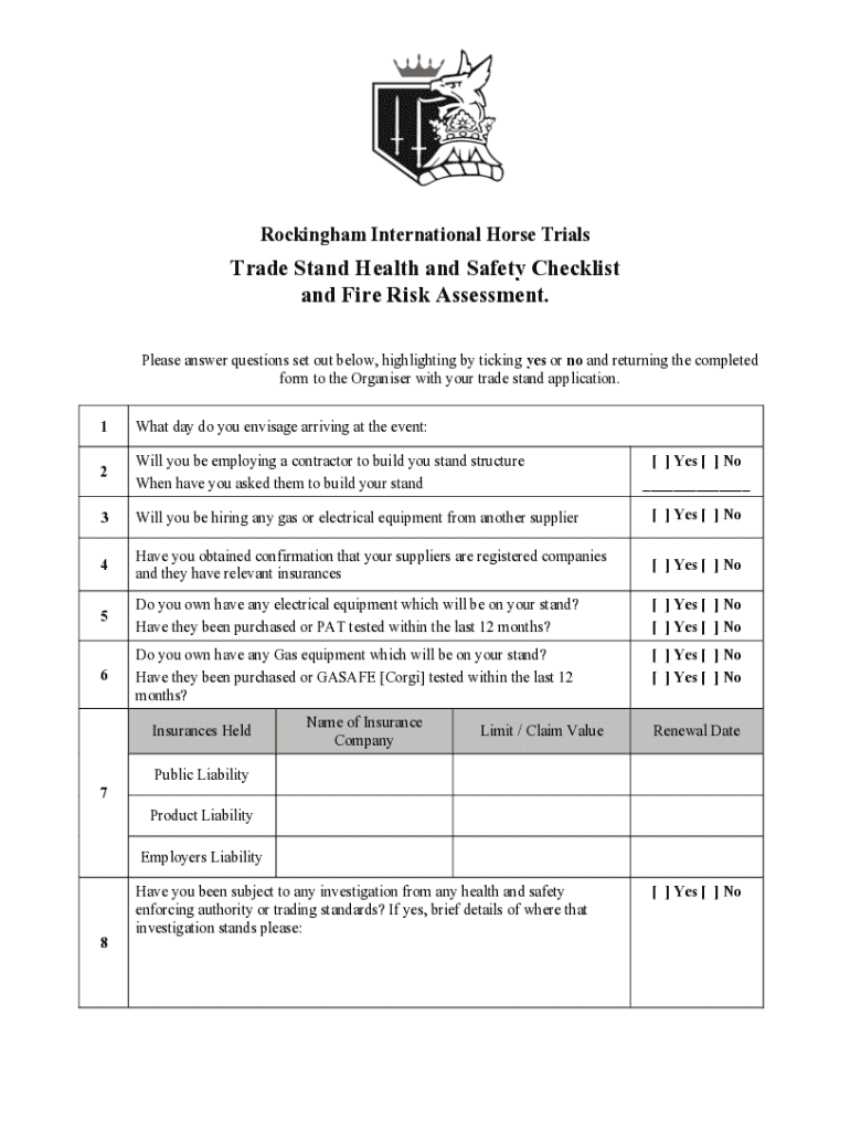 Rockingham International Horse TrialTrove Stand Health and Safety Checklist and Fire Risk Assessment. Please answer questions set out below, highlighting by ticking yes or no and returning the completed
