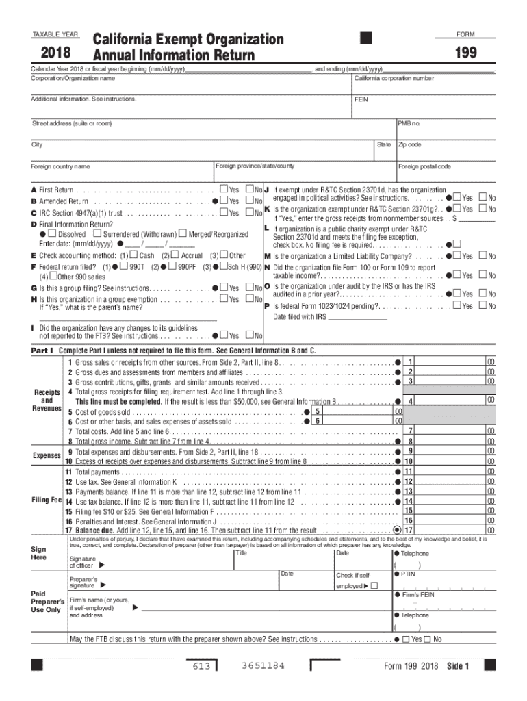 Complete the California Exempt Organization Annual Return Form 199 for 2018. This document is essential for tax-exempt organizations, detailing receipts and expenditures.