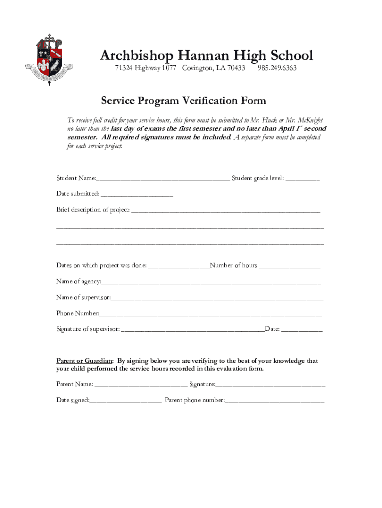 Archbishop Hannan High School 71324 Highway 1077 Covington, LA 70433985.249.6363Service Program Verification Form To receive full credit for your service hours, this form must be submitted to Mr.