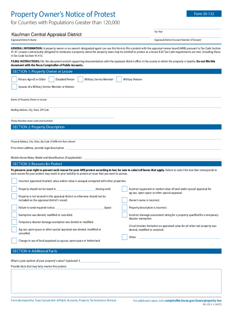 This form allows property owners in counties over 120,000 to protest appraisals. It outlines filing instructions and provides sections for property details and reasons for protest.