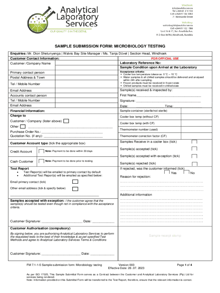 This document outlines the submission procedure for microbiology testing, including sample acceptance criteria and contact information for laboratory services.