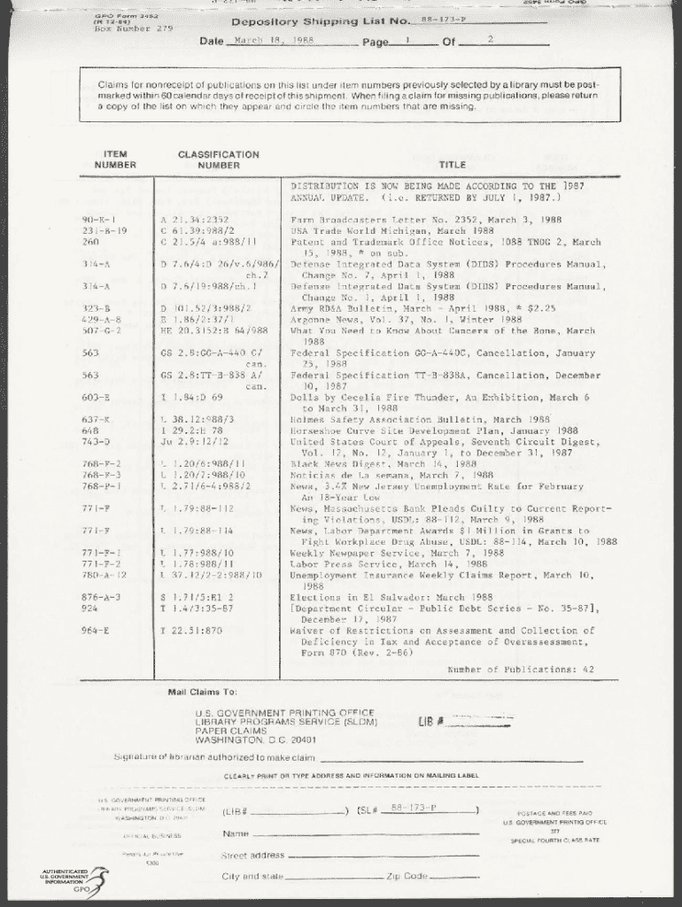 meeeGPOFormBoxNumber(R 1284)adaC Lit8o.3452eeDepository279yaShippingListSSPEWiedOdOekNo.__88173\"PClaims for nonreceipt of publications on this list under item numbers previously selected by a library