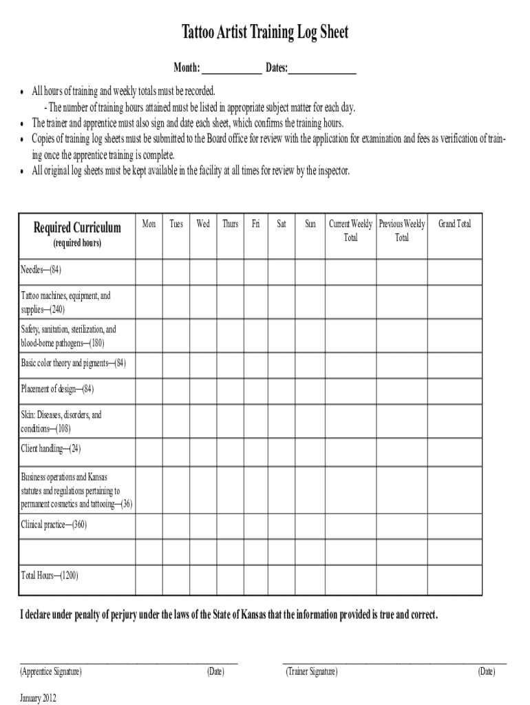 Tattoo Artist Training Log Sheet Month: ___ Dates:___ All hours of training and weekly totals must be recorded. The number of training hours attained must be listed in appropriate subject for each