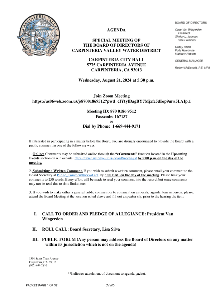 Get the free Special Meeting Agenda of the Carpinteria Valley Water District