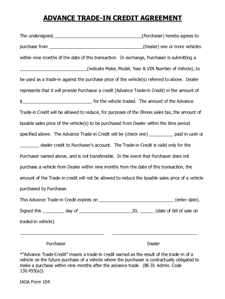 This document outlines the terms of an Advance Trade-In Credit Agreement between a Purchaser and a Dealer for vehicle purchases. It specifies credit terms and conditions.
