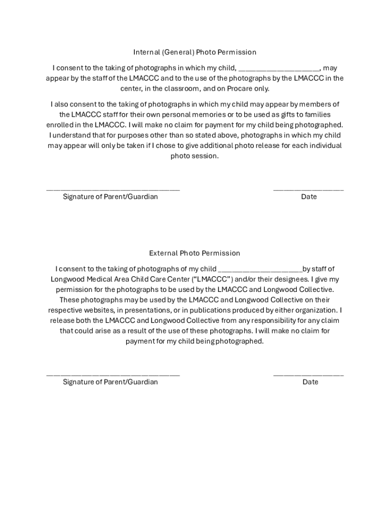 Internal (General) Photo Permission I consent to the taking of photographs in which my child, ___, may appear by the staff of the LMACCC and to the use of the photographs by the LMACCC in the center,