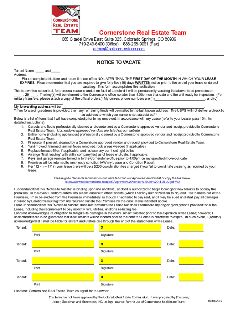 This document serves as a formal notice to vacate, outlining tenant obligations for a smooth move-out process with Cornerstone Real Estate Team.