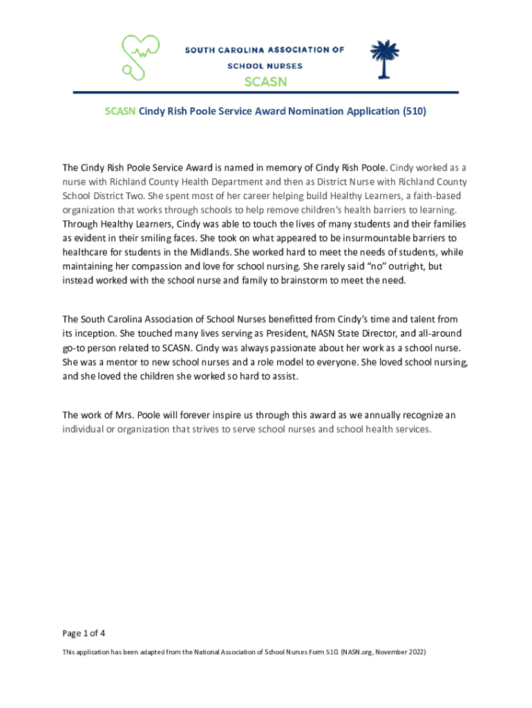Get the free SCASN Cindy Rish Poole Service Award Nomination Form 510.docx