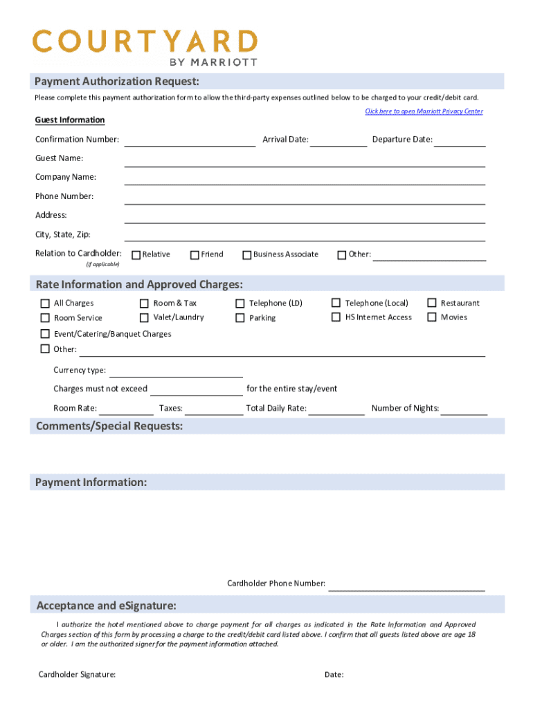 Payment Authorization Request: Please complete this payment authorization form to allow the third party expenses outlined below to be charged to your credit/debit card. Click here to open Marriott