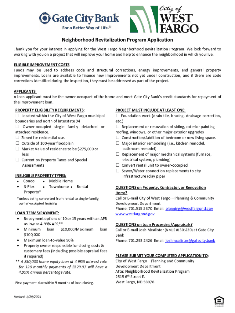 Neighborhood Revitalization Program Application Thank you for your interest in applying for the West Fargo Neighborhood Revitalization Program. We look forward to working with you on a project that