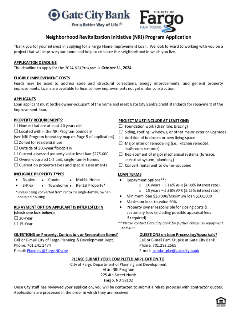 Apply for the 2024 Fargo NRI Program to access funds for home improvements. Learn about eligible costs, loan terms, and application details.