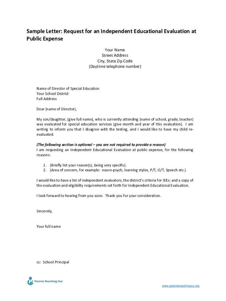 Sample Letter: Request for an Independent Educational Evaluation at Public Expense Your Name Street Address City, State Zip Code (Daytime telephone number)Name of Director of Special Education Your