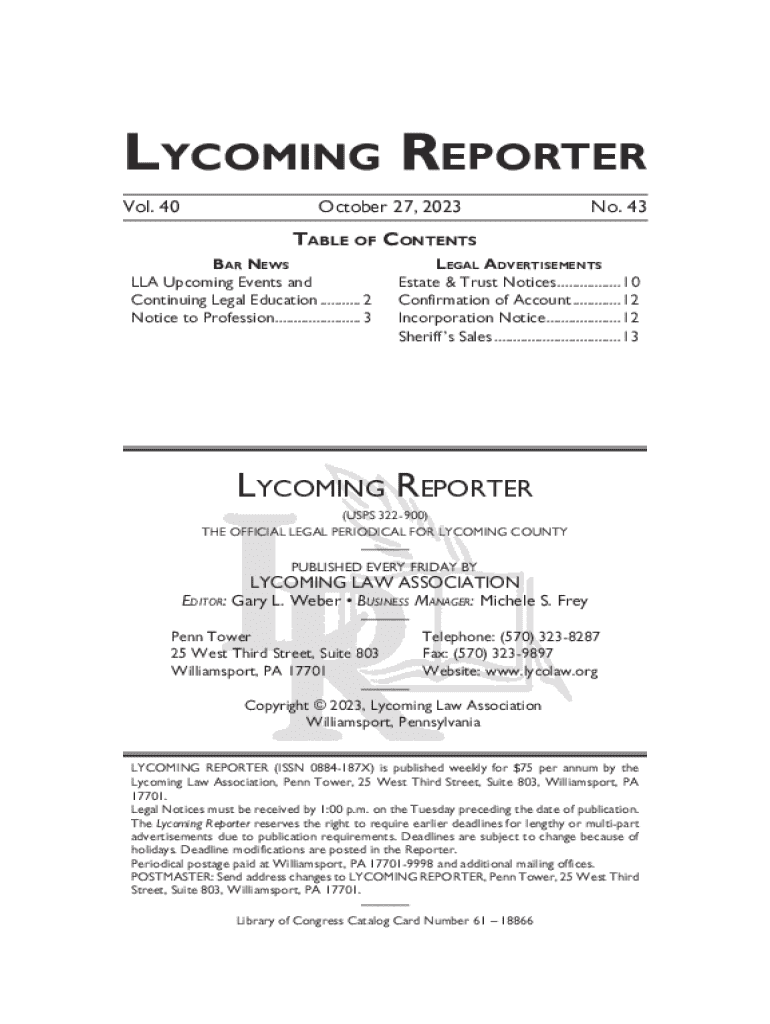 Stay updated with the latest legal news, events, and notices from Lycoming County in the Lycoming Reporter, published weekly. Discover upcoming continuing legal education opportunities.