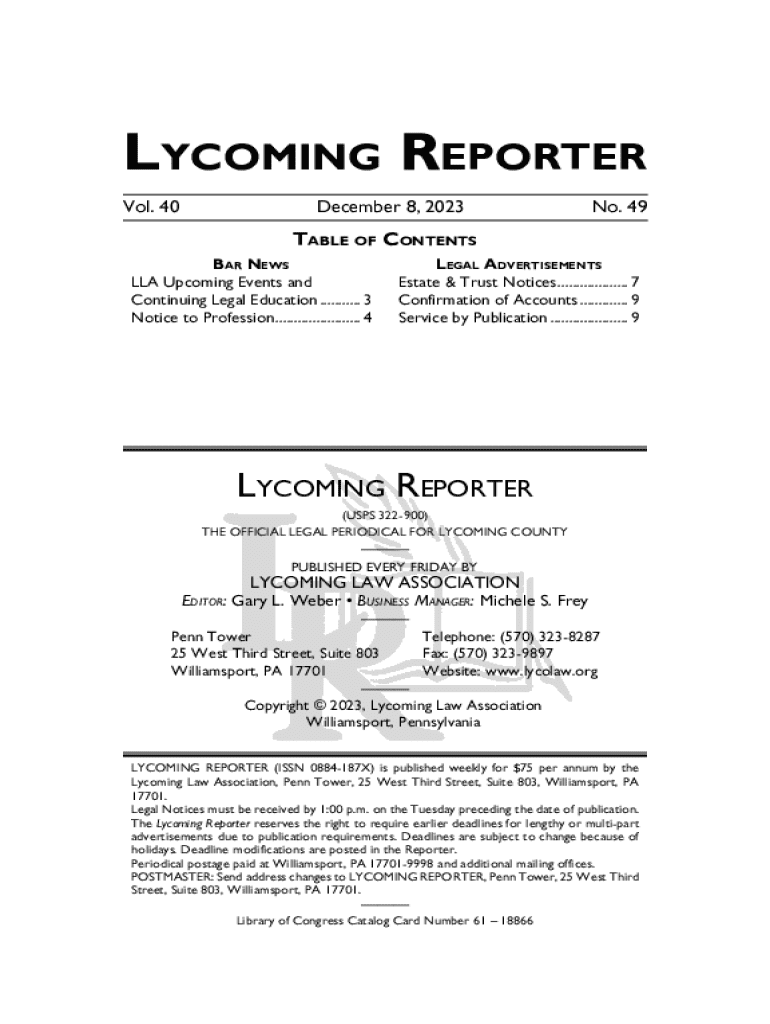 Lycoming Reporter Vol. 40December 8, 2023No. 49Table of Contents Bar News LA Upcoming Events and Continuing Legal Education............ 3 Notice to Profession........................ 4Legal Advertisements