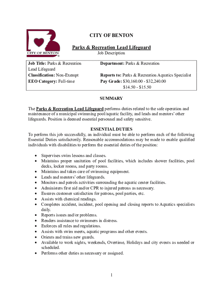 CITY OF BENTON Parks & Recreation Lead Lifeguard Job Description Job Title: Parks & Recreation Lead Lifeguard Classification: Nonexempt EEO Category: FulltimeDepartment: Parks & Recreation Reports
