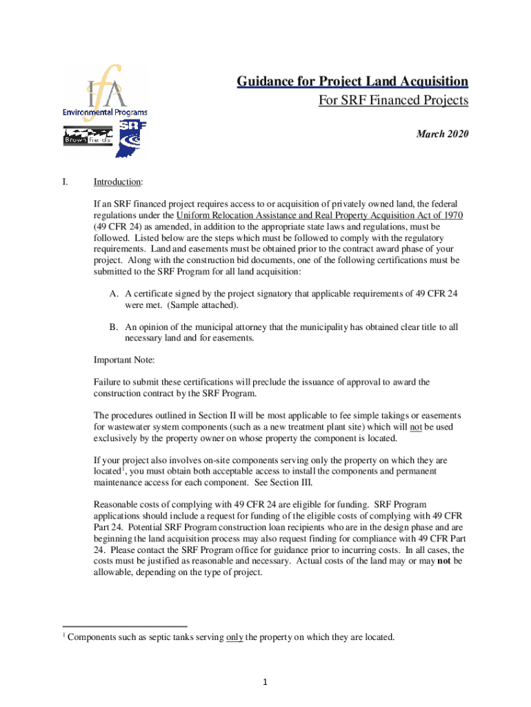 Guidance for Project Land Acquisition For SRF Financed Projects March 2020I. Introduction: If an SRF financed project requires access to or acquisition of privately owned land, the federal regulations